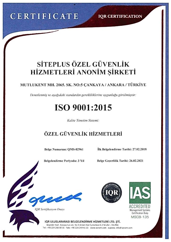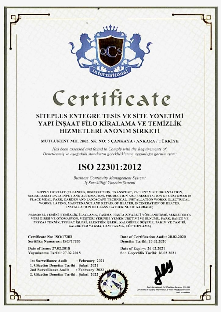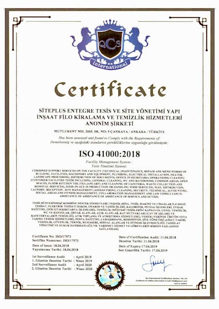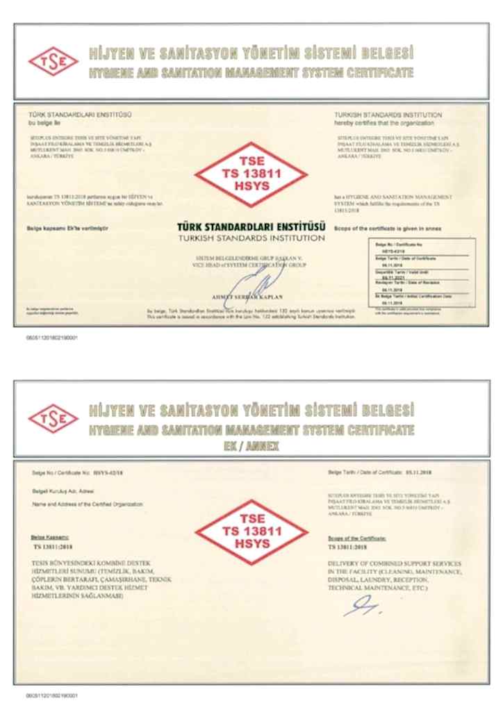 Entegre Tesis Yönetimi, Kurumsal Temizlik, Özel Güvenlik, Catering, Profesyonel Site Yönetimi gibi faaliyet gösterdiğimiz alanlardaki başarımızı kalite belgelerimiz ile tescilliyoruz. Siteplus olarak Entegre Tesis Yönetimi Hizmetinde; ISO 9001:2015 – Kalite Yönetim Sistemi, ISO 45001:2018 – İş Sağlığı ve Güvenliği Yönetim Sistemi, ISO 14001:2015 – Çevre Yönetim Sistemi, ISO 10002:2018 Müşteri Memnuniyeti Yönetim Sistemi, ISO 27001:2013 – Bilgi Güvenliği Yönetim Sistemi, ISO 41001:2018 – Tesis Yönetimi – Yönetim Sistemi sertifikalarına sahibiz. Siteplus Özel Güvenlik Hizmetlerinde ise; ISO 9001:2015 – Kalite Yönetim Sistemi, ISO 45001:2018 – İş Sağlığı ve Güvenliği Yönetim Sistemi, ISO 14001:2015 – Çevre Yönetim Sistemi, ISO 27001:2013 – Bilgi Güvenliği Yönetim Sistemi, ISO 18788:2015 – Özel Güvenlik Hizmetleri Yönetim Sistemi kalite belgeleri ile faaliyetlerimizi yürütüyoruz. Profesyonel temizlik alanındaki çalışmalarında TSE TS 13811:2015 HSYS Hijyen ve Sanitasyon Yönetim Sistemi Belgesi’ni almaya hak kazanan sektöründeki ilk firma Siteplus olmuştur. Ayrıca Siteplus, Catering hizmetlerinde de ISO 22000 Gıda Güvenliği Yönetim Sistemi belgesine sahiptir.