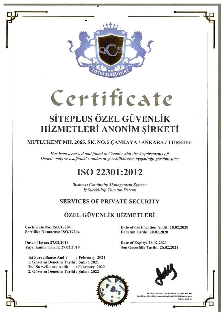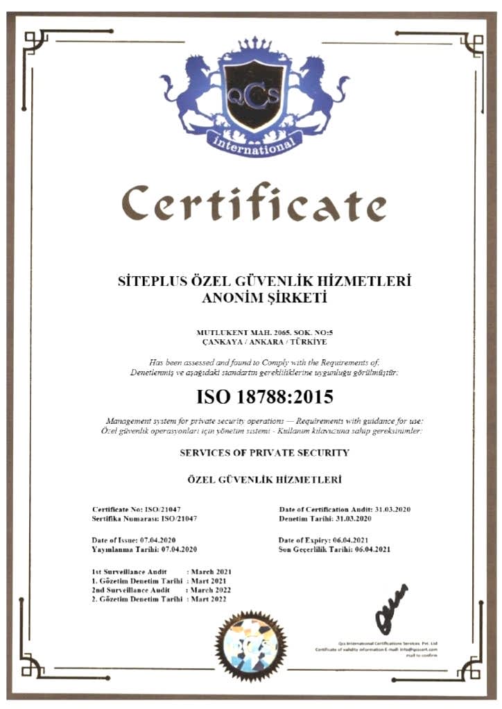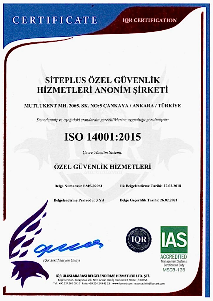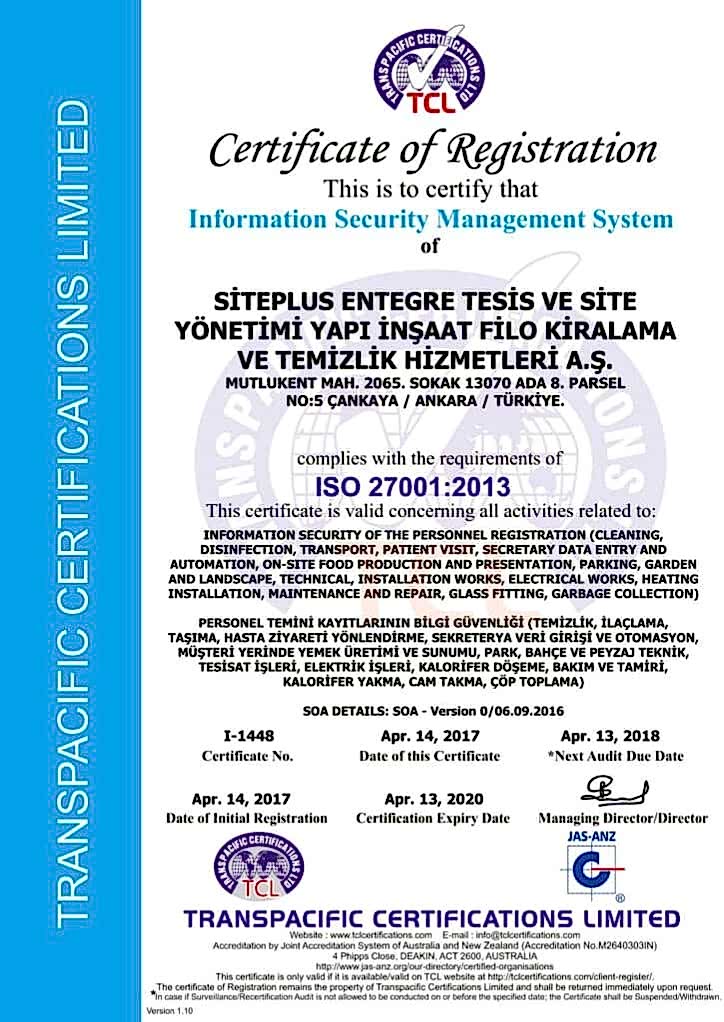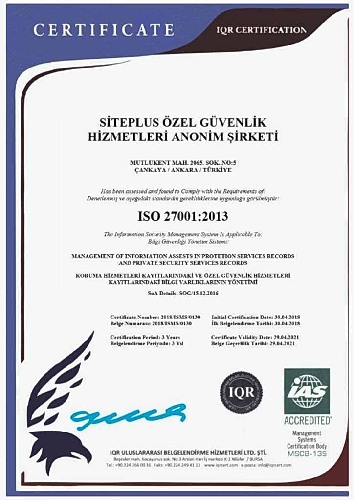 Entegre Tesis Yönetimi, Kurumsal Temizlik, Özel Güvenlik, Catering, Profesyonel Site Yönetimi gibi faaliyet gösterdiğimiz alanlardaki başarımızı kalite belgelerimiz ile tescilliyoruz. Siteplus olarak Entegre Tesis Yönetimi Hizmetinde; ISO 9001:2015 – Kalite Yönetim Sistemi, ISO 45001:2018 – İş Sağlığı ve Güvenliği Yönetim Sistemi, ISO 14001:2015 – Çevre Yönetim Sistemi, ISO 10002:2018 Müşteri Memnuniyeti Yönetim Sistemi, ISO 27001:2013 – Bilgi Güvenliği Yönetim Sistemi, ISO 41001:2018 – Tesis Yönetimi – Yönetim Sistemi sertifikalarına sahibiz. Siteplus Özel Güvenlik Hizmetlerinde ise; ISO 9001:2015 – Kalite Yönetim Sistemi, ISO 45001:2018 – İş Sağlığı ve Güvenliği Yönetim Sistemi, ISO 14001:2015 – Çevre Yönetim Sistemi, ISO 27001:2013 – Bilgi Güvenliği Yönetim Sistemi, ISO 18788:2015 – Özel Güvenlik Hizmetleri Yönetim Sistemi kalite belgeleri ile faaliyetlerimizi yürütüyoruz. Profesyonel temizlik alanındaki çalışmalarında TSE TS 13811:2015 HSYS Hijyen ve Sanitasyon Yönetim Sistemi Belgesi’ni almaya hak kazanan sektöründeki ilk firma Siteplus olmuştur. Ayrıca Siteplus, Catering hizmetlerinde de ISO 22000 Gıda Güvenliği Yönetim Sistemi belgesine sahiptir.